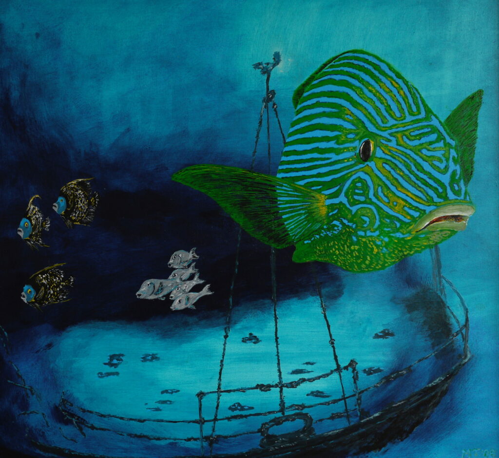 Schilderij van een grote vis die over een scheepswrak zwemt