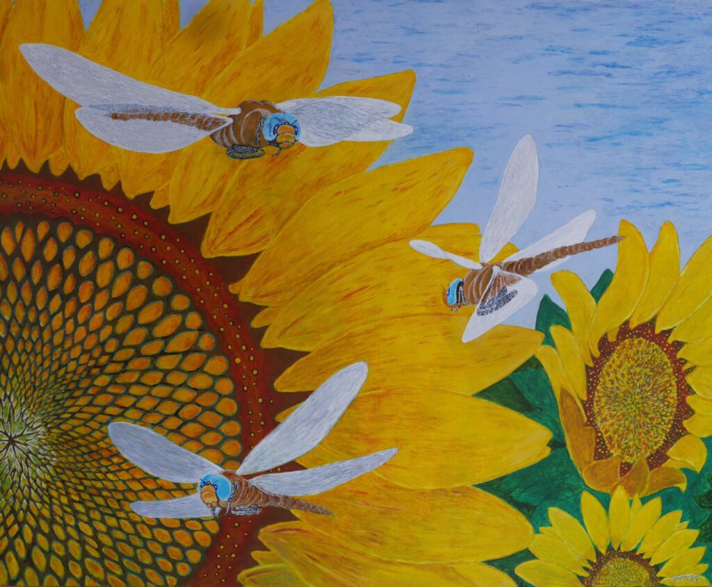 Schilderij met zonnebloemen en vliegende insecten