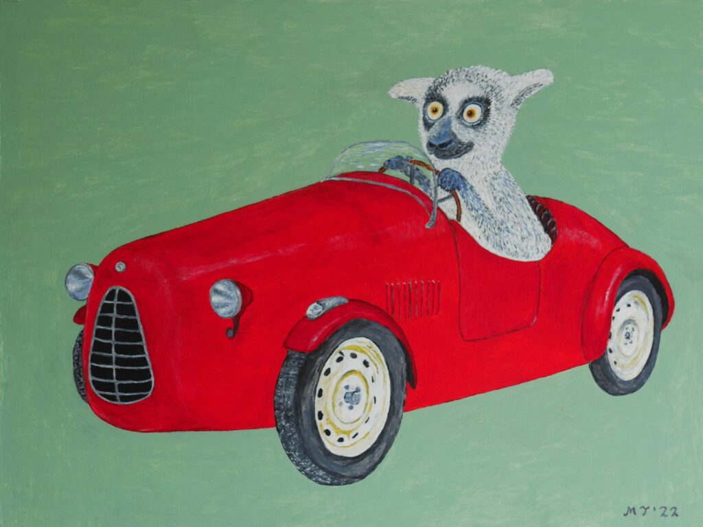 Schilderij van een grijs nachtdiertje in een rode racewagen